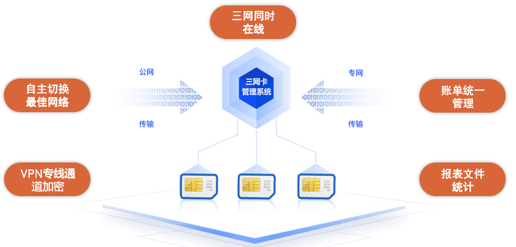 三网合一卡可同时支持三大运营商网络,设备插卡后可自主选择当前最优运营商网络(例如:当前移动信号不好时,可手动或自动切换为联通或电信网络);VPDN专线可在公网内单独分离一条数据传输通道,保证数据传输安全;卡管理平台具备三网卡及设备的相关数据管理功能。