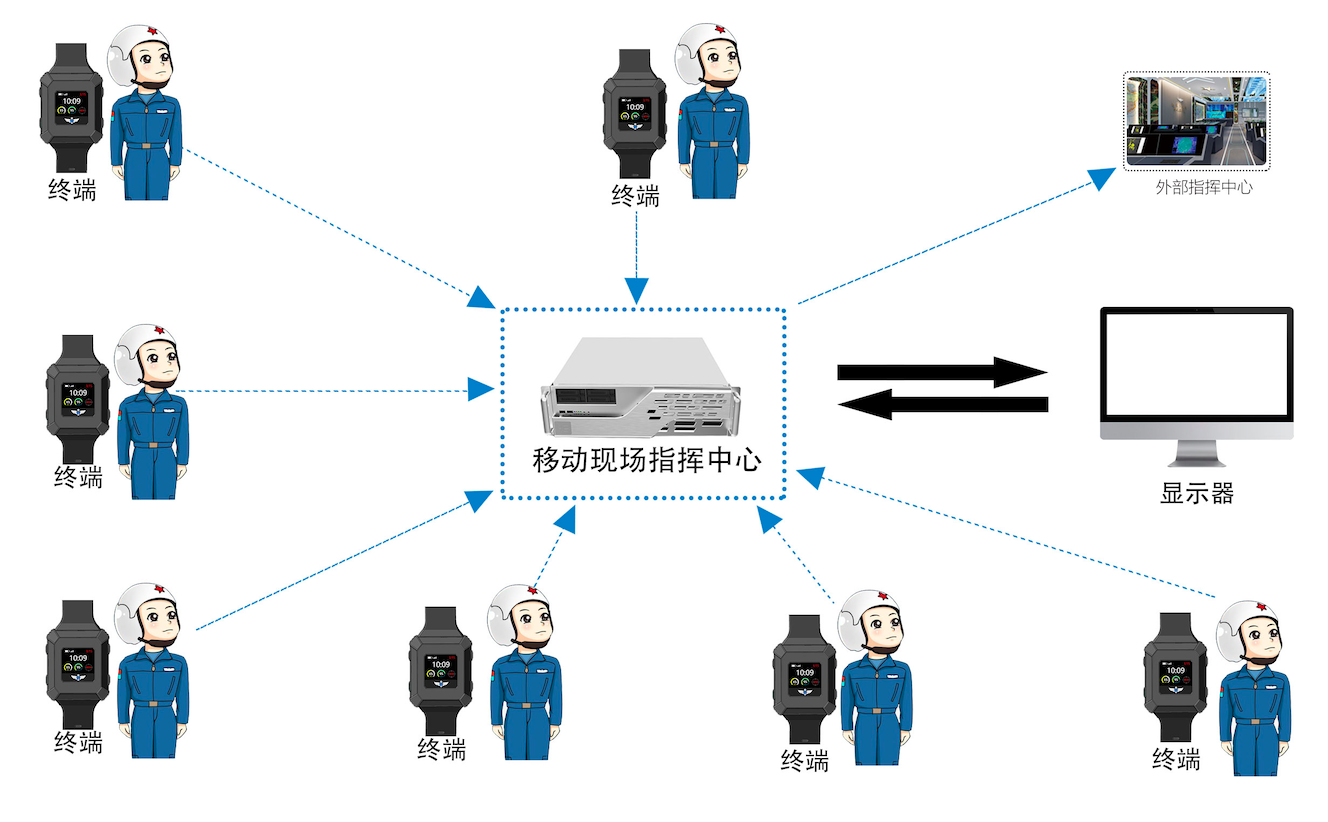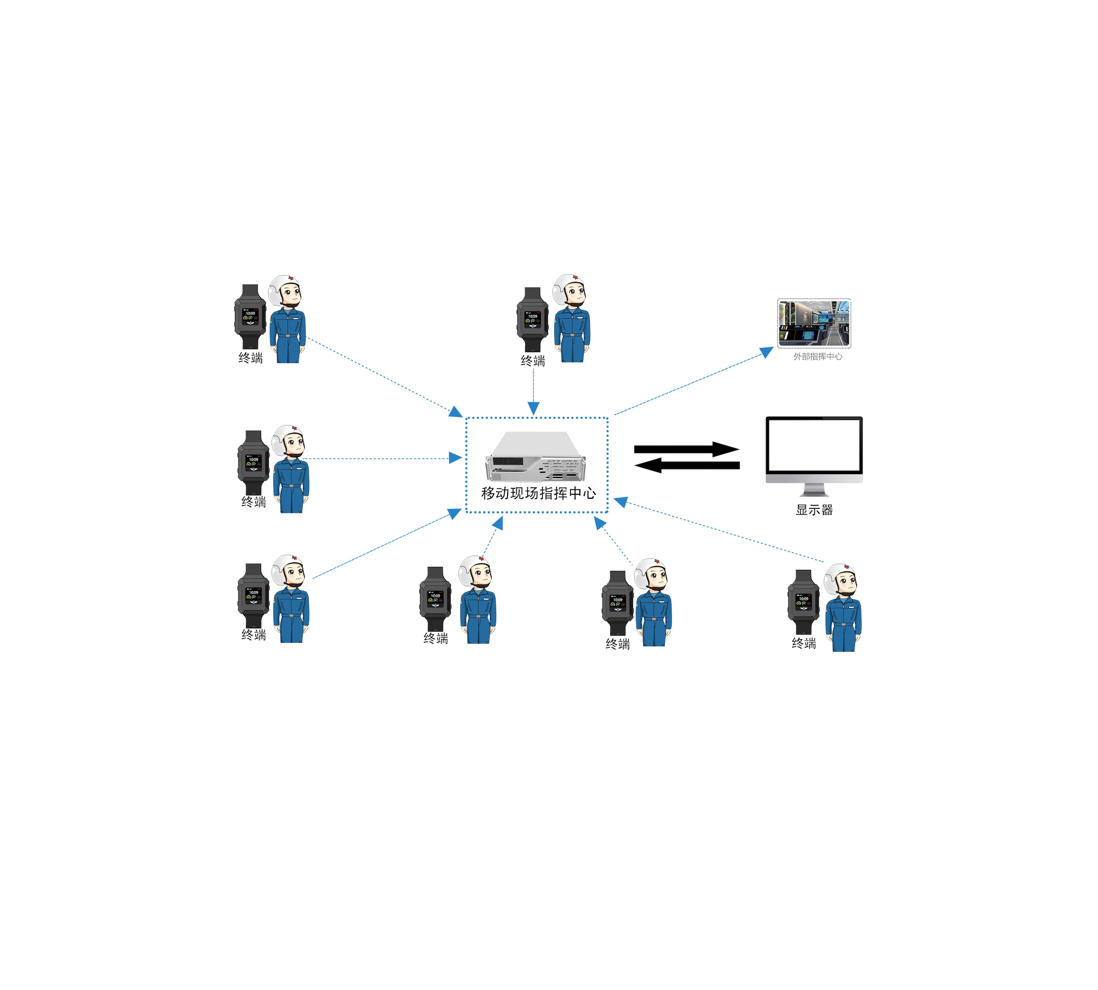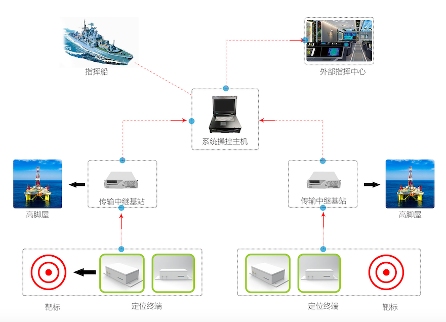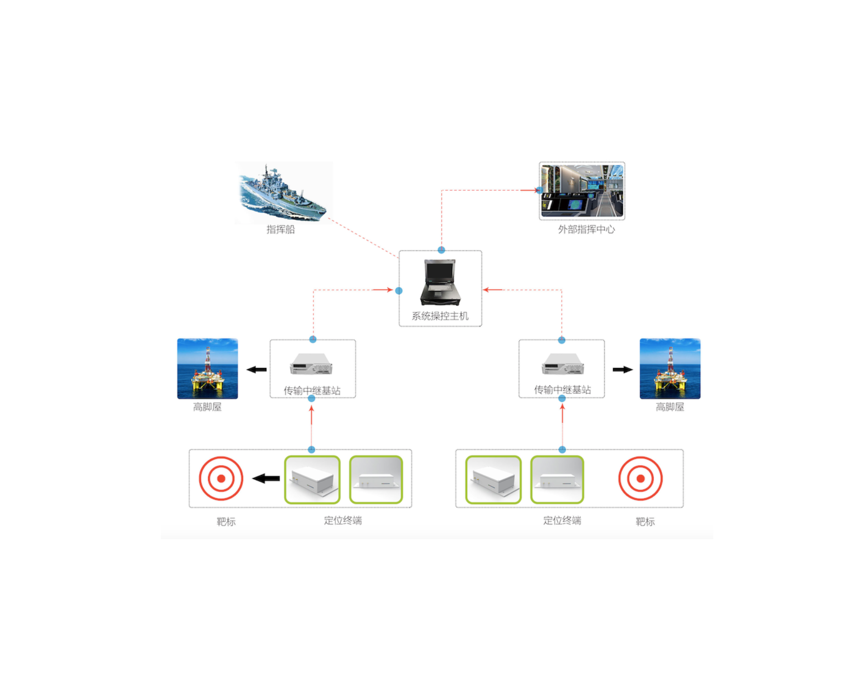 系统由定位终端、传输中继基站和系统操控主机组成;系统可快速搭建,无需架设有线网,具有良好的容灾抗毁性。整体网络架构中,系统操控主机作为定位系统的指挥平台,可接收各个网络节点的信息,同时可使用卫星链路、公网链路等方式,向后方传递定位信息。